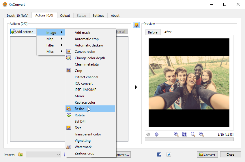 - The "Add actions" menu allows you to add effects like Image watermark, Text watermark, Cropping, Rotating, Image adjusting, …