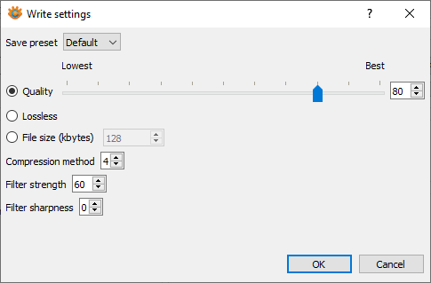 Some formats come with its own settings, accessible from the “Settings” button directly underneath the pull-down menu. In case of JPEG files, the most crucial parameter is the compression/quality ratio.